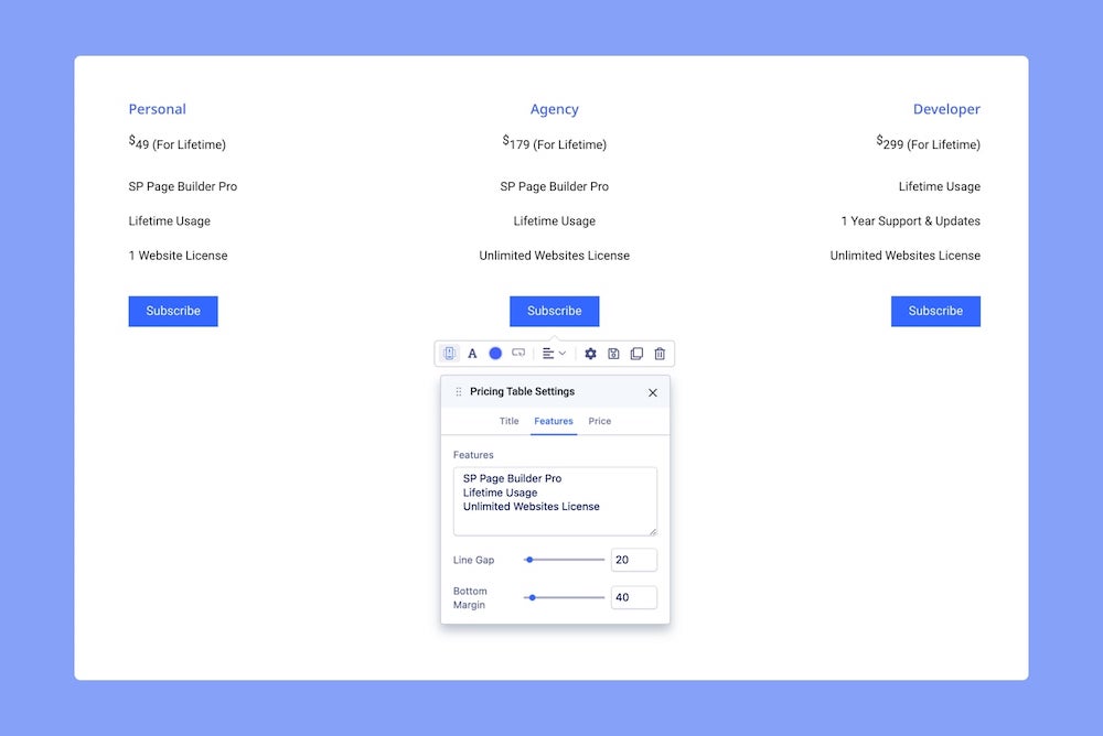 Bottom Padding: Set the Pricing’s Bottom Margin. This is the space between the content and its bottom border.