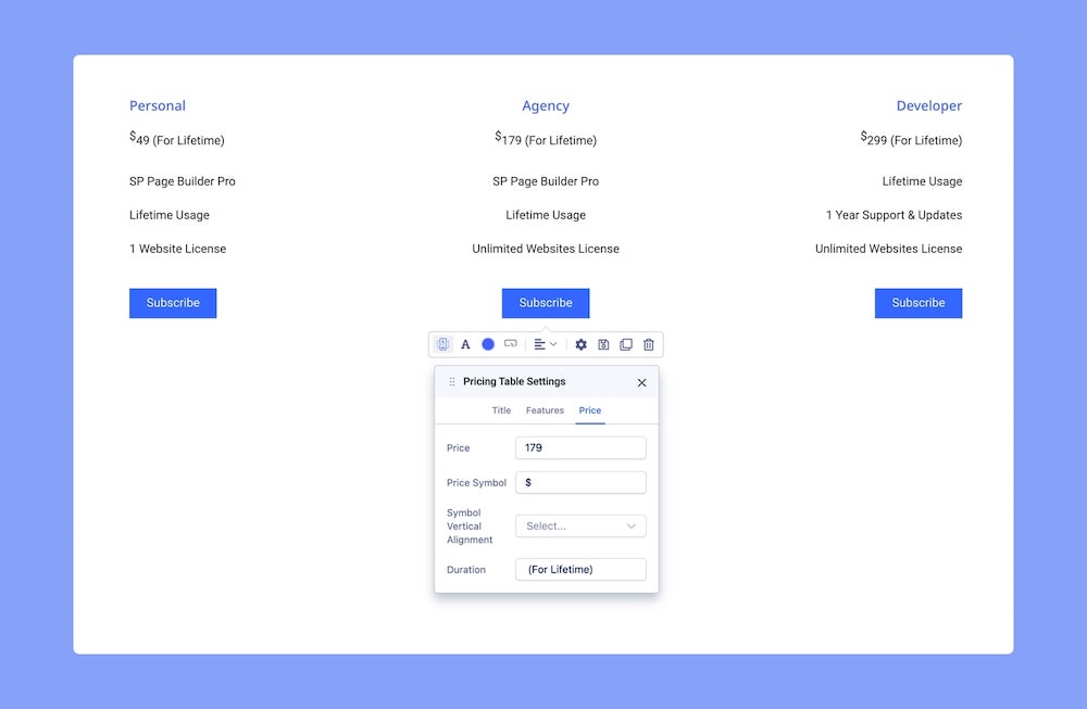 To adjust the Pricing Table’s Alignment, click on its icon on the inline editor. Alignment options include Left, Center, Right, and Justified.