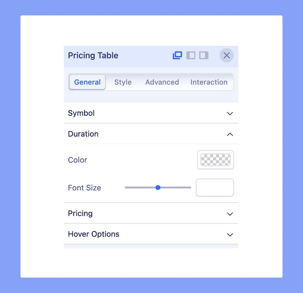 Further Pricing Table customizations can be done from Settings > General. To open this panel, click on the Settings icon on the inline editor.