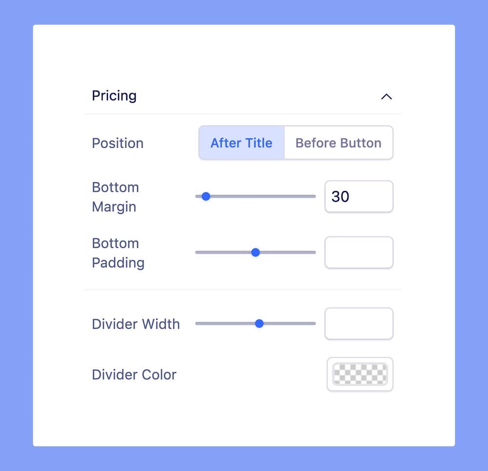 Position: Set the Pricing’s placement. Options include After Title and Before Button.