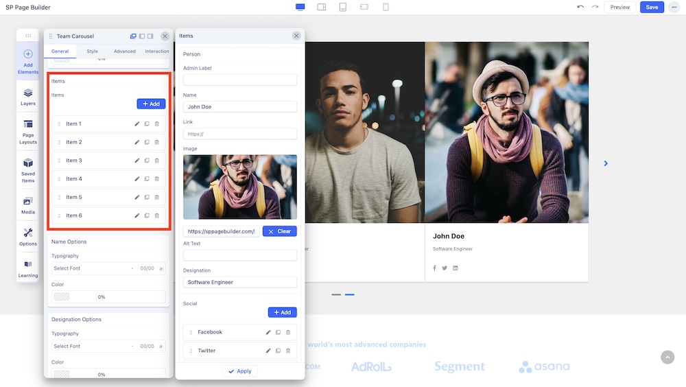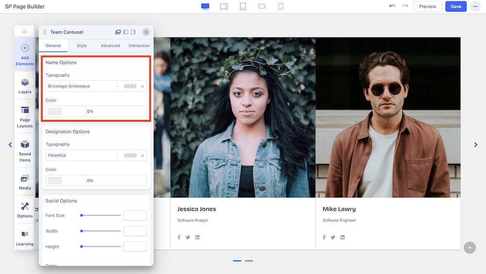 Change the typography options such as the font and font color of the names displayed in the carousel.