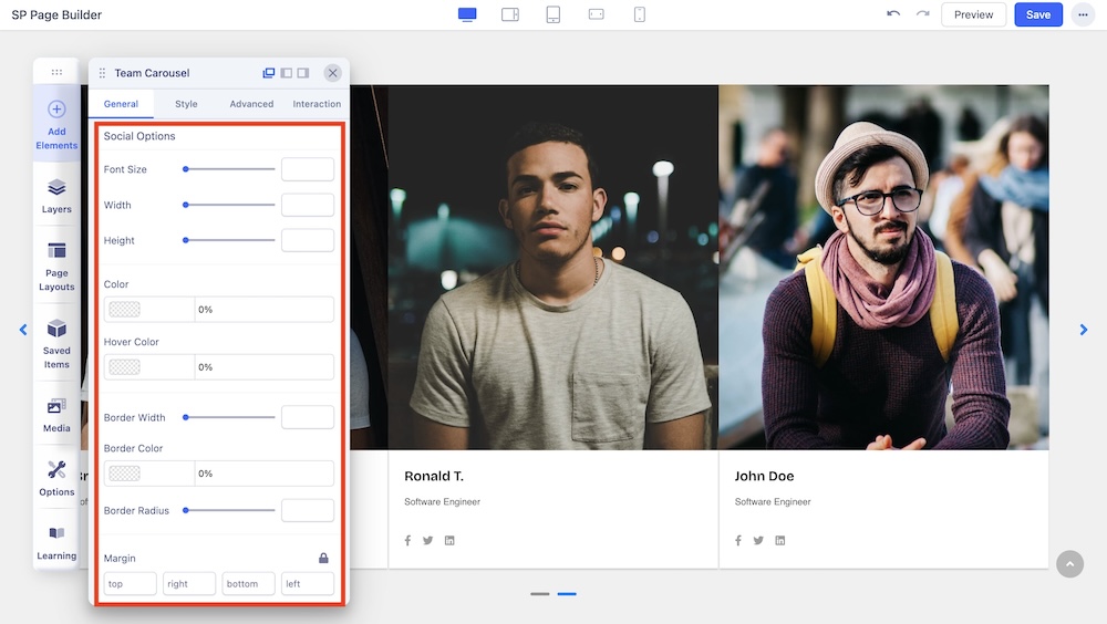 You can also customize the font size, style, color, margin, and border settings of the social icons in this section.