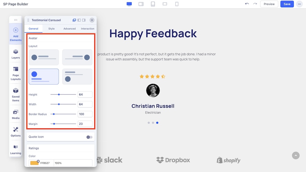 You can customize the layout of the avatar from four different options. You can also adjust the height, width, border radius, and margin of the avatar in this section.