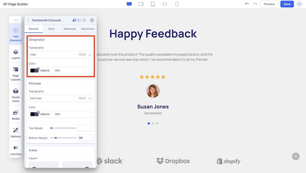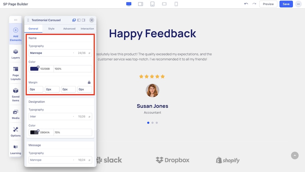 Change the typography options such as the font and font color of the names displayed in the carousel. Also, adjust the margins of the name.