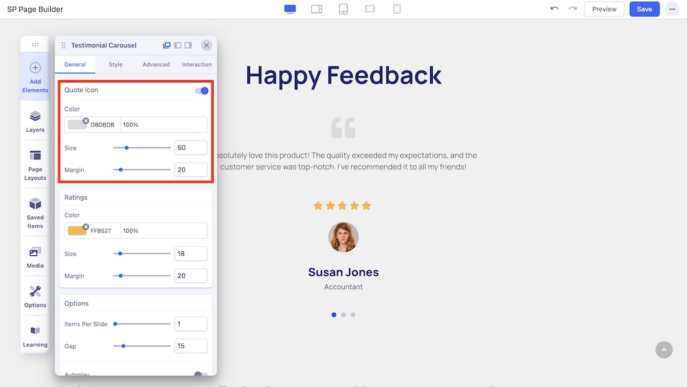 You can enable the quote icon and adjust the color, size, and margin of the quote icon.