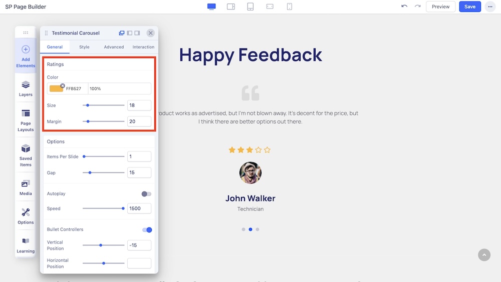 You can adjust the color, size, and margin of the ratings icons.