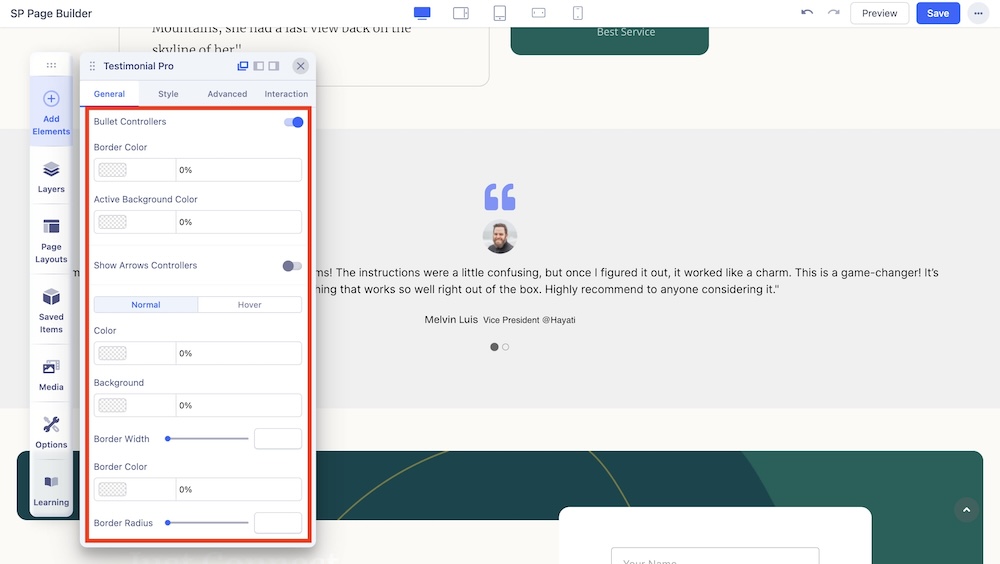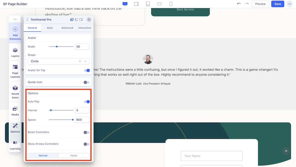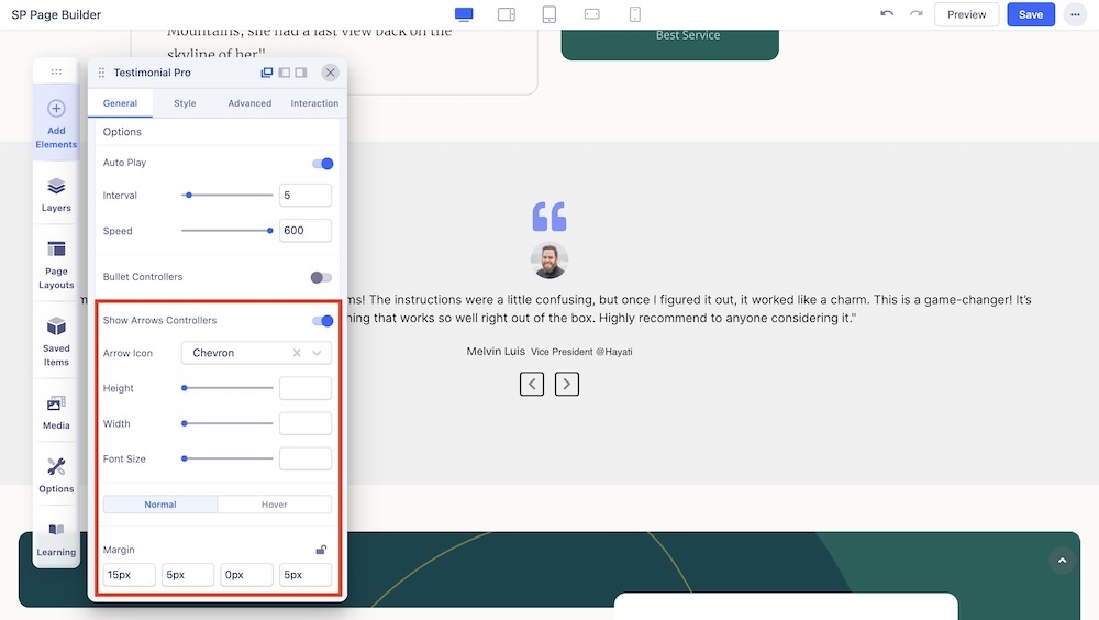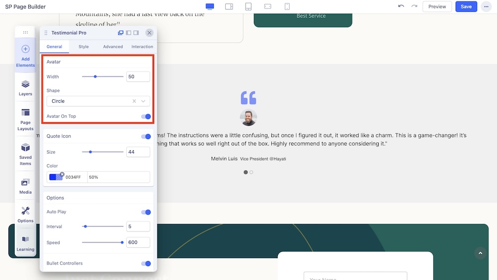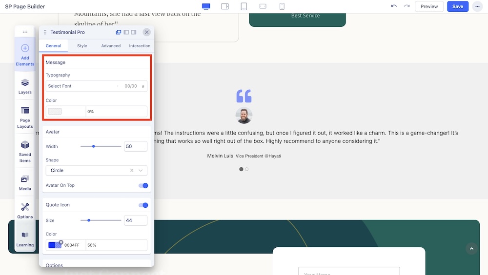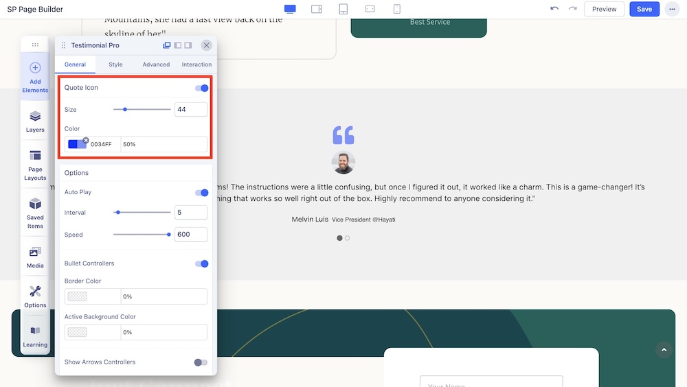 You can enable this option to show the quote icon around the testimonial message and adjust the color and size of the quote icon.