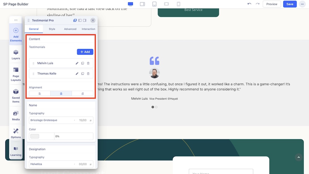 You can add the Testimonial Pro addon to your page from the SP Page Builder sidebar. Simply drag the addon from the Addons panel and drop it on the section of the page where you want to add the Testimonial Pro.