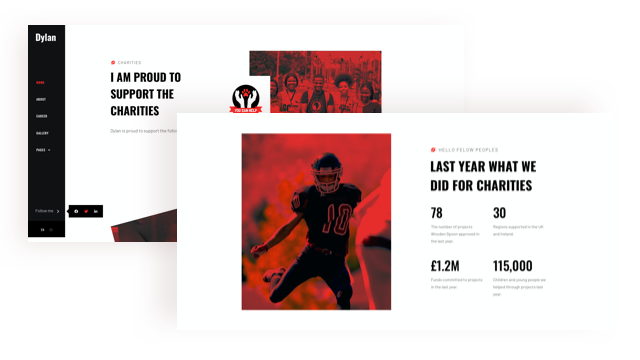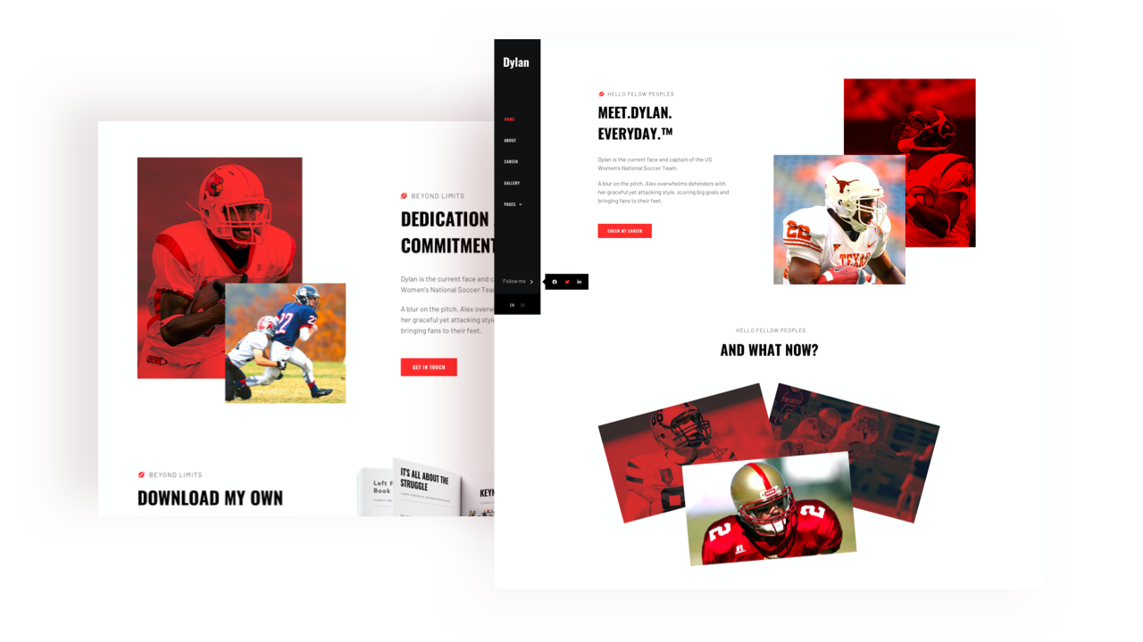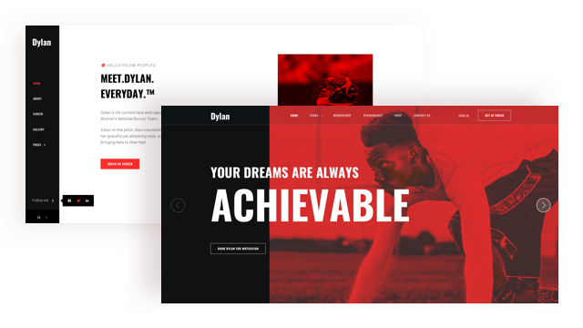 Dylan is an athlete portfolio Joomla template for all kinds of sportsmen including rugby player, footballer, cricketer, and tennis star. With 2 home variations, 2 header designs, and awe-striking pages, Dylan is a complete website package for sportsmen of all categories. Athletes can showcase their experience, training, photos, and more.
