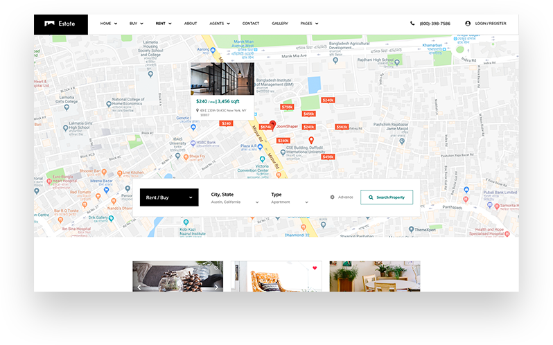 Search by Map: This home layout comes with a map having a search module followed by a collection of listed properties.