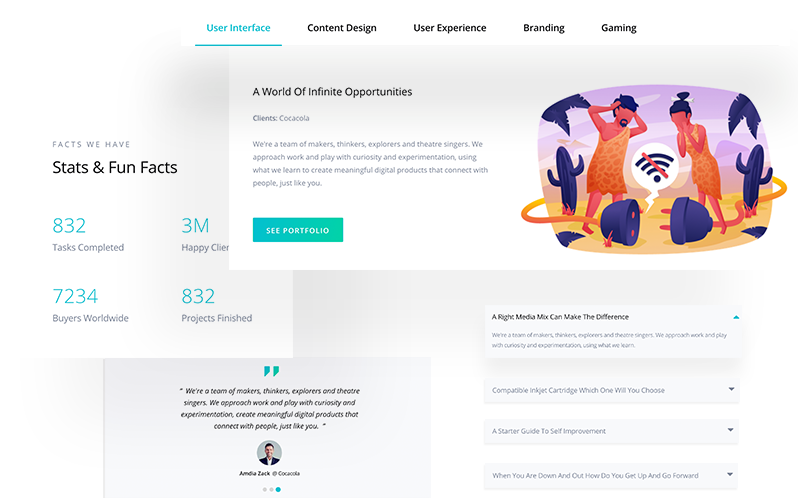 About: Have company description, team members, mottos in different designs. There’s also a tabbed section in one of these variations.