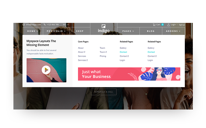 Contact: There are 2 contact page variations in Indigo, You can either go with Google Map or without it on the contact page.