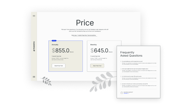 Maestro comes with a dedicated pricing page that will present your pricing plans in the most persuasive way with FAQs and well-directed CTAs. The minimal clutter-free design lets users focus on your plans and pricing information.