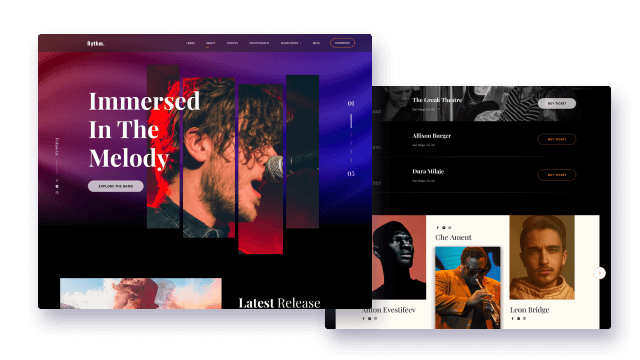 Rythm comes with a spectacular design well suited for the music industry. You can showcase special moments, display musical events and concerts, have news and stories on a creatively designed homepage. Create great impressions with a modern home layout for your music band.