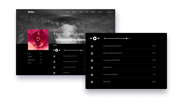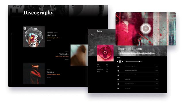 Do you have music albums? Rythm lets you showcase music albums and listen to songs online. List your albums in a timeline on a nice discography page. Appeal to music lovers with a sleek display of your music albums.