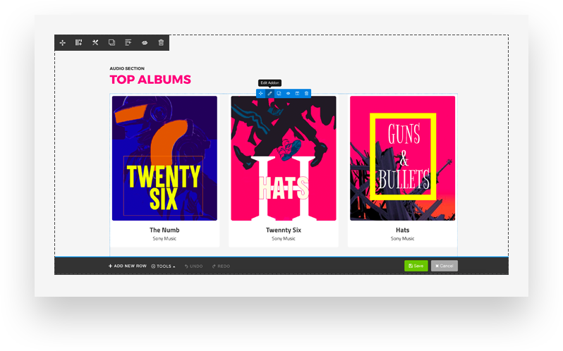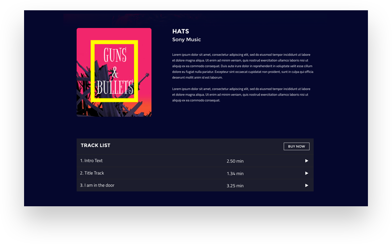 Artists and musicians can create albums and display on their sites to let the audiences find their music works organized in one place. Albums contain album-arts and detailed information. Music tracks can be made available to play and sell online via these albums.