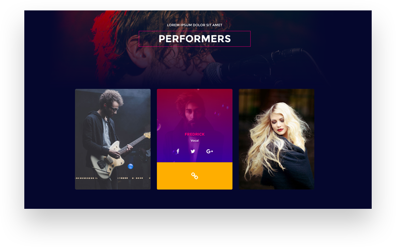 The Performers page is amazingly designed that displays contents and artist information with a stunning look and eye-catching design.